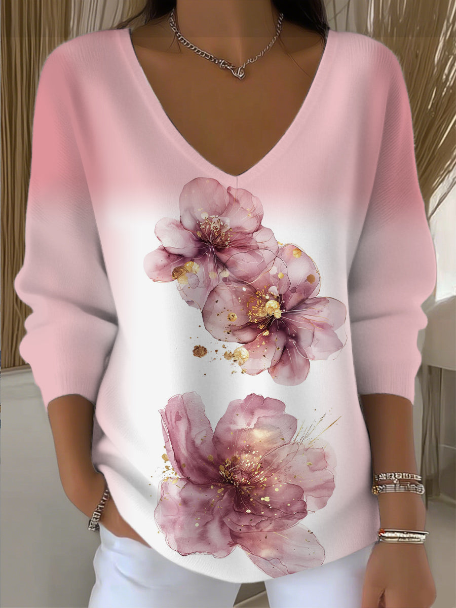 Γυναικείο ρομαντικό ροζ λουλούδι V - λαιμό πουλόβερ