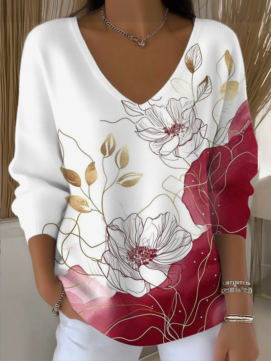 Γυναικεία Chic χρυσό & κόκκινη γραμμή τέχνης Εκτύπωση V - λαιμό κορυφή
