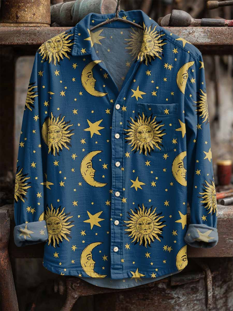 Retro ήλιος και σελήνη εκτύπωση μακριά μανίκι πουκάμισα